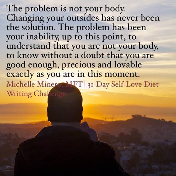 “If you have ever hated your body, ever wanted to lose weight or believed that if you lost weight you would feel better about yourself, you have mistakenly thought that your problem was your body. It is not. Changing your outsides has never been the solution. The problem has been your inability, up to this point, to understand that you are not your body, to know without a doubt that you are good enough, precious and lovable exactly as you are in this moment.”