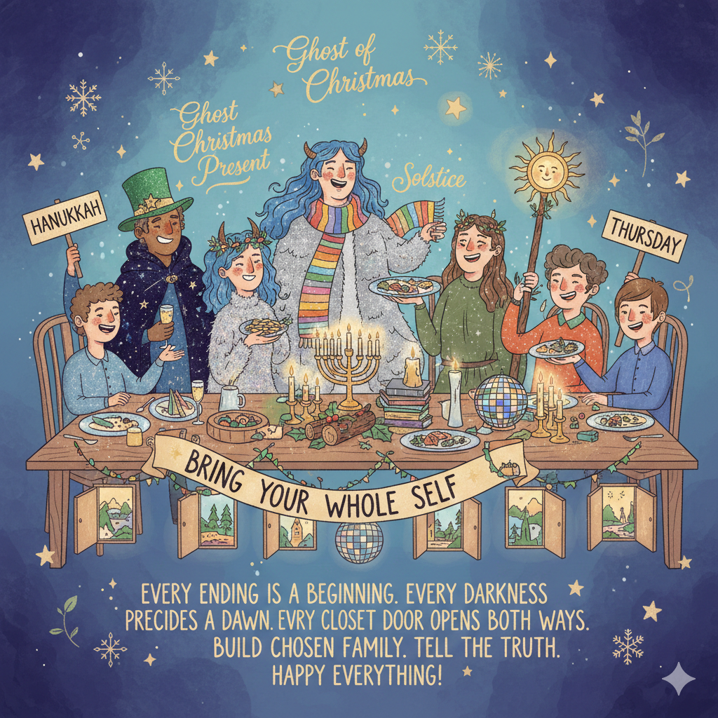 So this Christmas—or Solstice, or Hanukkah, or Thursday—be the Ghost of Christmas Present to yourself. Bring your whole self to the table. Wear the metaphorical (or literal) glitter. Tell the truth. Build chosen family. Remember that every ending is a beginning, every darkness precedes a dawn, and every closet door opens both ways.