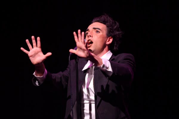 In black suit, loosely tied black tie, white shirt sticking out of his trousers on one side, tousled hair and heavy mascara, it’s a very deliberate look: wide-eyed, childlike, with manic rushing from subject to subject. It’s almost as if he daren’t settle his thoughts anywhere.