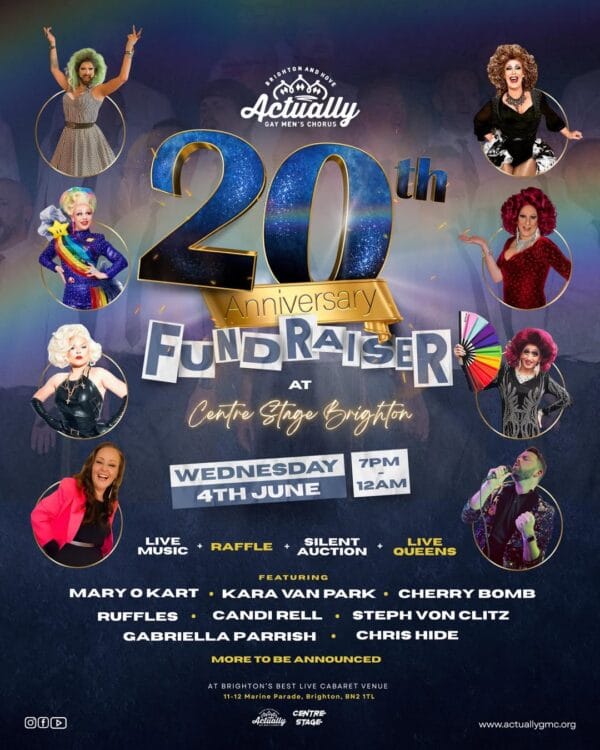 On Wednesday, 4 June, Centre Stage Brighton will be celebrating ActuallyGMC’s 20th Anniversary with Ruffles hosting top cabaret from Kara Van Park, Stephanie Von Clitz, Mary O’Kart, Cherry Bomb, Candi Rell-Dq, Gabriella Parrish, Chris Hide, plus more to be announced!