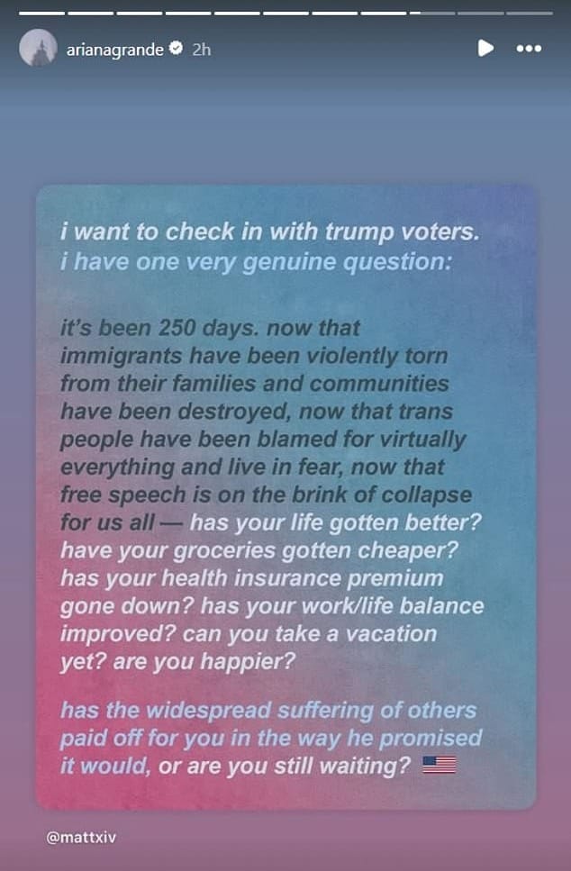 Grande, a long-time advocate for LGBTQ+ equality, reposted a powerful message from activist Matt Bernstein on Instagram, calling out the devastating impact of Trump’s policies on trans people, immigrants, and marginalised groups. The post, shared with her 523 million followers, read: “It’s been 250 days. Now that immigrants have been violently torn from their families and communities have been destroyed, now that trans people have been blamed for virtually everything and live in fear, now that free speech is on the brink of collapse for us all - has your life gotten better?”