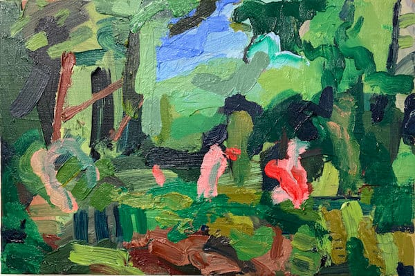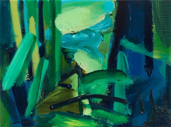 However abstracted they have gradually become, in making them the immediacy of his applied brush strokes and the vivacity of the hues he utilises, are the results of his continued attempts to link decisions to places and memories of them, both visual and in feeling. The intuitive decisions and chance developments that are an inherent element of the painting process playing their part in how each painting finally resolves. The image developing its own persona in the studio whilst informed by the recalled memories of the landscape, the specifics of the time of day, the shift of light conditions, the weather interacting with tree and grass blade, heard sounds and atmospheres, all contributing to the making of the paintings.