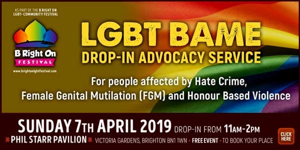 As part of the B RIGHT ON LGBT+ Community Festival the Brighton and Hove LGBT Community Safety Forum host an LGBT BAME Drop-In Advocacy Service. The event is for BAME (black, Asian and minority ethnic) people affected by hate crime, female genital mutilation (FGM) and honour based violence (HBV).
