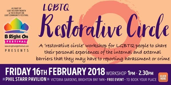 As part of the B RIGHT ON LGBT Community Festival, the Brighton & Hove LGBT Community Safety Forum (B&H LGBT CSF) present an LGBT Restorative Circle workshop in partnership with the Brighton & Hove City Council Workers Forum.