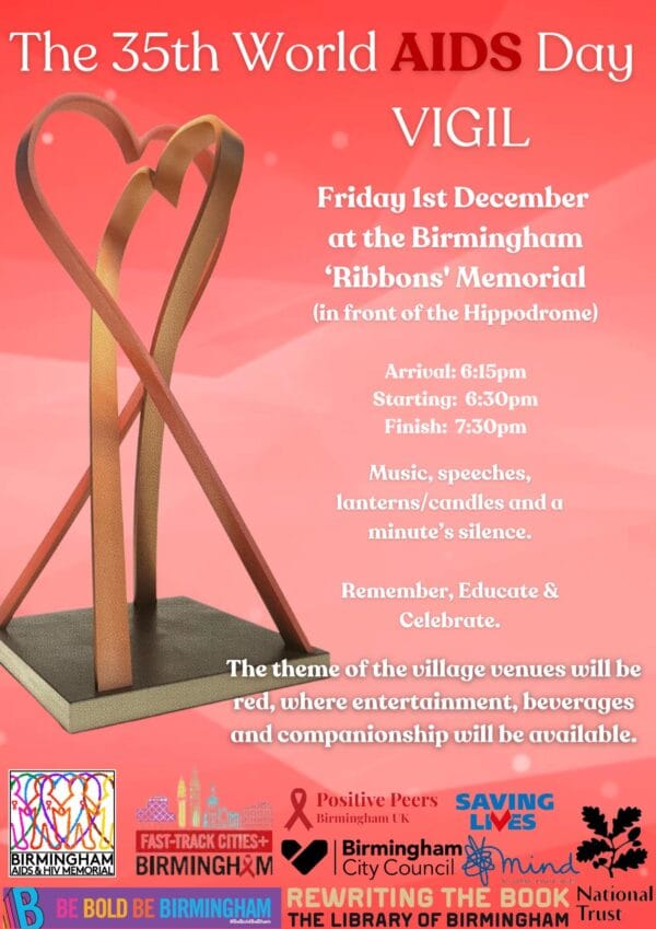 Birmingham will mark the 35th World AIDS Day with a vigil at the ‘Ribbons’ HIV and AIDS Memorial, Hippodrome Square on Friday, December 1. The event, designed to “remember, educate and celebrate”, will feature music, speeches, candles and lanterns, and a minute’s silence. Those who wish to join the