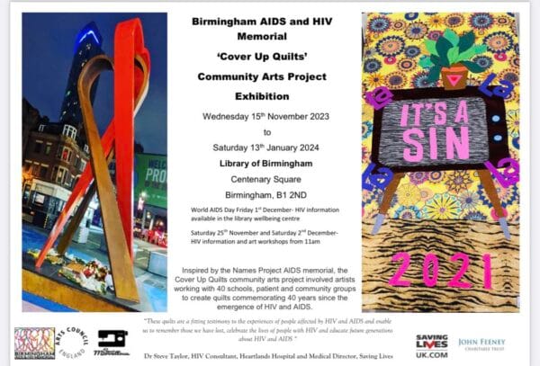 In the lead up to World AIDS Day, from November 15 to January 13, 2024, some of HIV Cover-Up Quilts, which were first showcased at the unveiling of the Ribbons Memorial, will be on display in the Library of Birmingham, Centenary Square. On World AIDS Day, the library will also have HIV information available in their wellbeing centre; this information will also be available on Saturday, November 25 and Saturday, December 2. Additionally, art workshops will be held on these Saturdays from 11am.