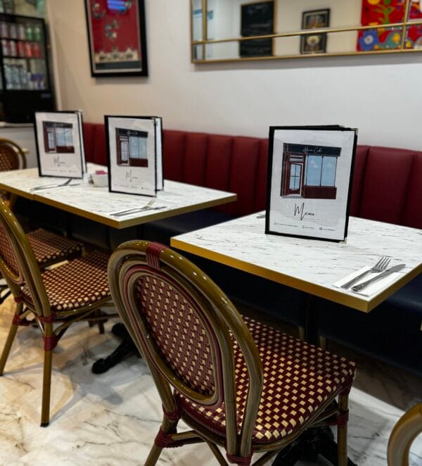 Our new décor, very Franglais if I may say, combines comfortable banquet and seating with fresh colours and paintings by local artists.