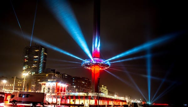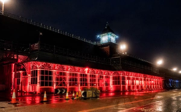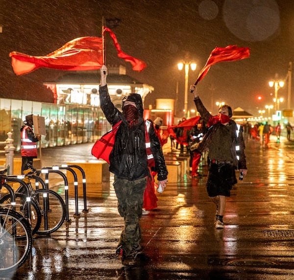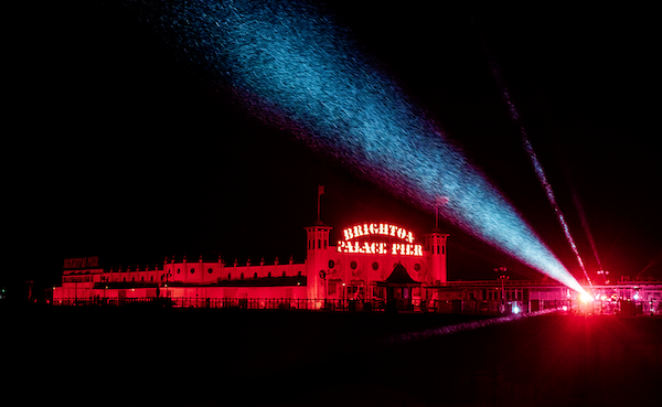 Lasers and intelligent lights lit up the sky and the Palace Pier, bouncing off the driving rain. At 8pm the peaceful protest saw phones lit up red and a three-minute silence attracting supportive honks from passing cars.
