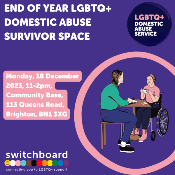 Brighton & Hove LGBTQ+ Switchboard is inviting LGBTQ+ survivors of domestic abuse to reflect on 2023 at its free December Survivor Space event, hosted by the Domestic Abuse team from 11am – 2pm on Monday, December 18 at Community Base, 113 Queens Road, Brighton, BN1 3XG.
