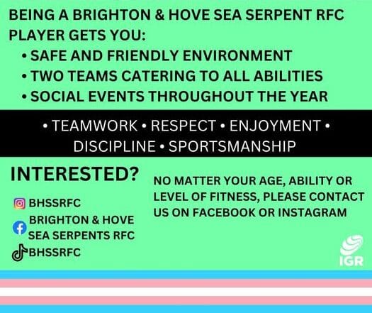 By joining the Brighton & Hove Sea Serpents, you’ll experience the thrill of the game while forging lasting connections with like-minded individuals who share your passion for rugby and your commitment to breaking stereotypes. Together, we challenge societal norms and pave the way for a more accepting world.