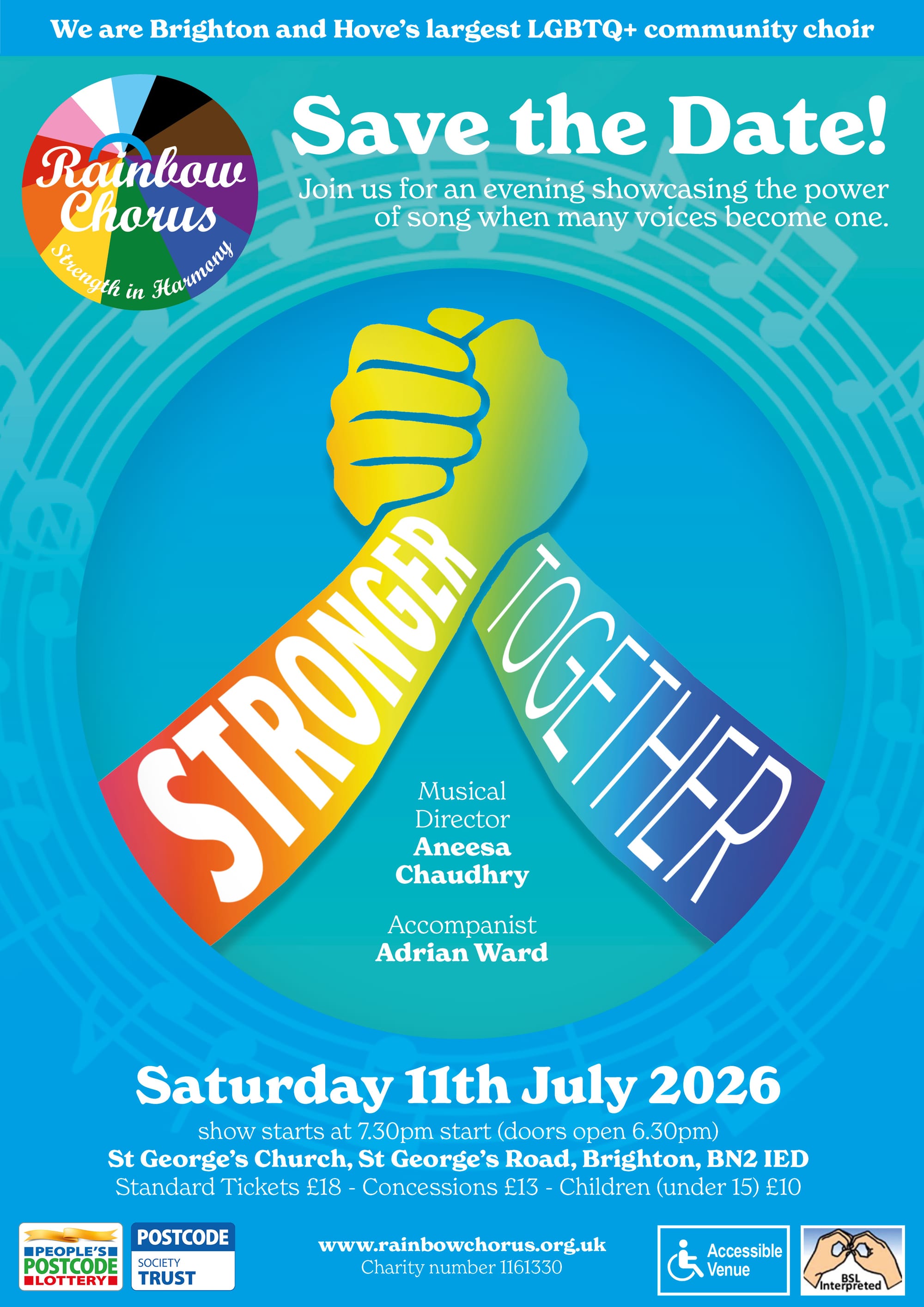 Branded with the powerful theme Stronger Together, the newly released poster is a bold visual celebration of solidarity, featuring interlinked arms in a rainbow spectrum, an unmistakable symbol of collective resilience and pride. It reflects the choir’s ongoing mission: to bring people together through the transformative power of song.
