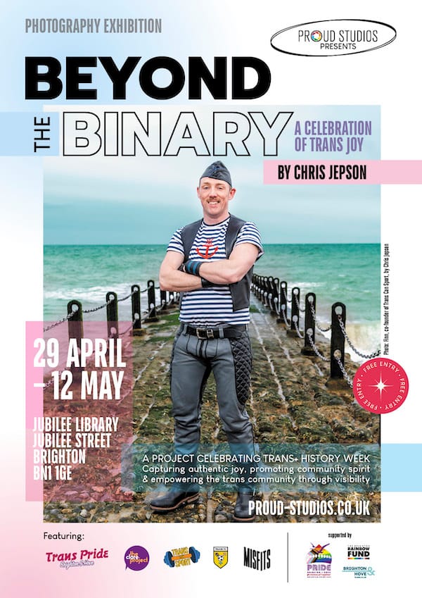 Beyond The Binary – A Celebration Of Trans Joy is a collaboration between Brighton-based award-winning photographer and queer artist Chris Jepson, trans groups including Trans Pride Brighton & Hove, the Clare Project, Trans Can Sport, TReNBI FC Brighton, Misfits and Transkaters, as well as numerous trans individuals.