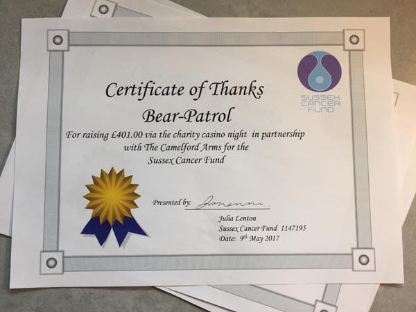 A charity casino night at the Camelford Arms last month staged in association with Bear-Patrol raised £401 for a local cancer charity.