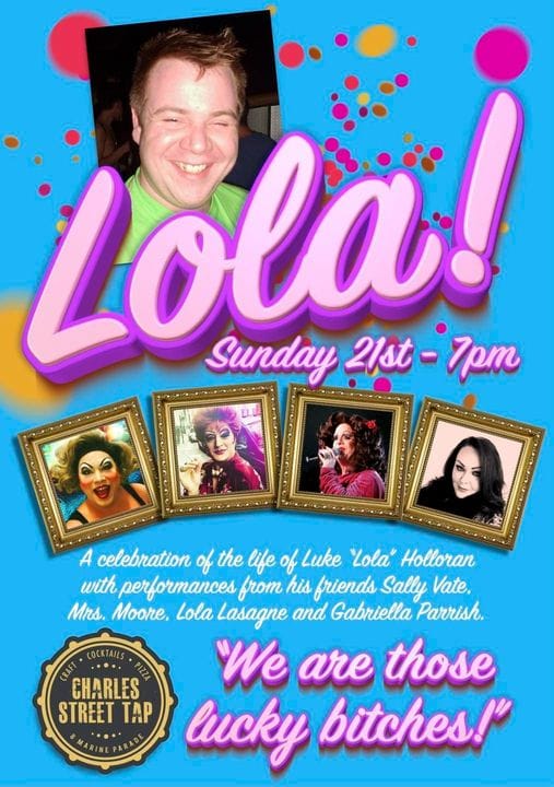 Charles Street Tap in Brighton is to celebrate the life of “dear friend” Luke ‘Lola’ Holloran onSunday, January 21 from 7pm with performances from his friends – Sally Vate, Mrs Moore, Lola Lasagne and Gabriella Parrish. Charles Street Tap say: “It is going to be night of song, laughter and no doubt