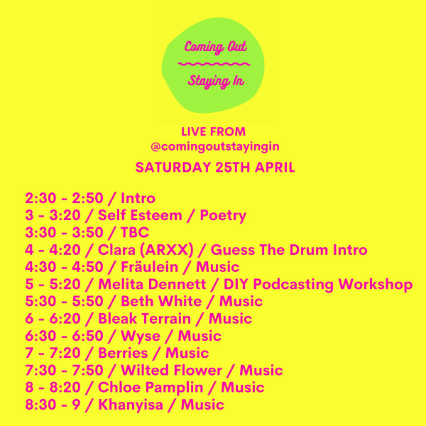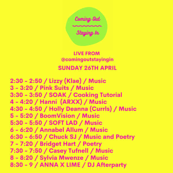 Coming Out Staying In will take place on the @comingoutstayingin Instagram profile.