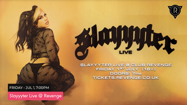 Oh and Slayyyter will be performing all of her biggest hits such as Mine, Daddy AF, Hello Kitty & more at Club Revenge in Brighton on Friday, July 1 – woop! See you there bitches. For tickets, CLICK HERE