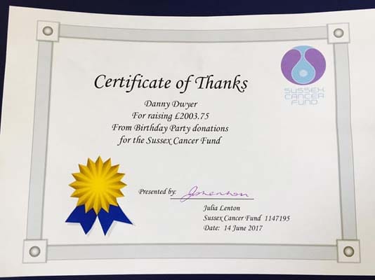 Danny asked people attending to make donations to the Sussex Cancer Fund rather than send cards or bring presents.