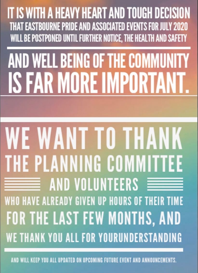 The Covid-19 pandemic has been terrible news for Pride festivals up and down the country – the latest to announce that its event has been cancelled is Eastbourne Pride.
