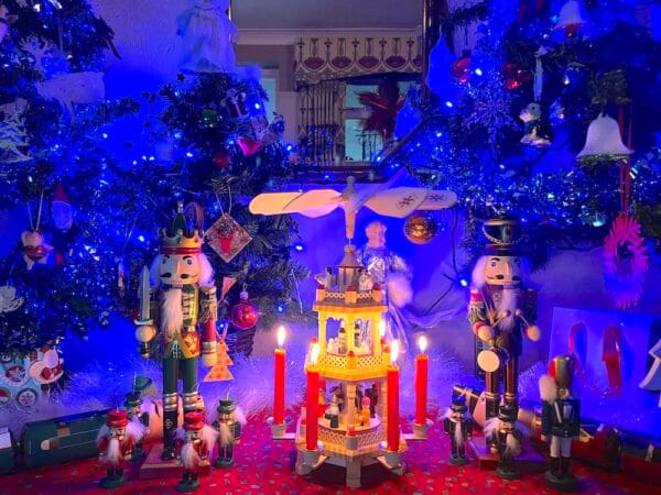 Also in his collection is a Christmas candle pyramid, which is known as the Weihnachtspyramide. While the candle pyramid is popular throughout Europe now, as well as in the US., it was originally found in the Erzgebirge, the Ore Mountains between Germany and the Czech Republic. The same area is also known for its wooden toy making tradition too. Once upon a time, people danced around a St. John’s tree, a pyramid of flowers and garlands, around the time of the summer solstice. Eventually this custom, some say, evolved into our modern Christmas tree. Luckily Geoff has a large collection of these wooden toy decorations, but their origin is from the US on visits there over the last 30 years. They will however add to the allusion.