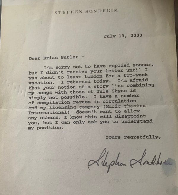 My third encounter was by letter. In 2000 I had the idea of writing an original storyline about a twisted romance, but using the songs of both Jule Styne and Stephen Sondheim. I wrote to SS, seeking his permission. Amazingly in July I got a carefully typed but signed letter back, stating my plan “ is simply not possible. I have a number of compilation revues in circulation and my licensing company doesn’t want to allow any others. I know this will disappoint you, but I can only ask you to understand my position”. He signed it “ Yours regretfully, Stephen Sondheim”. And irony of ironies, the letter had got wet in transit and when I opened it, his signature was slightly smudged. My show was never written.