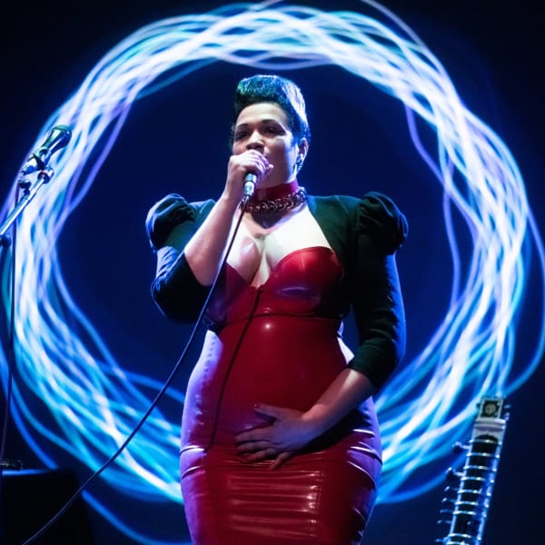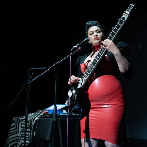 We have layered sounds – the voice of BISHI has real tone and giddy range; the harmonies as tight as the latex outfit, which amplifies the sumptuous curves as the voice is amplified and arcs around it. All is soft, bound – movement, flesh, sensuality, vocality, thought. This is not a music concert but an experience, an invitation (and invocation?) to sing of the body electric with a person whose cultural currents are strong. We plug in and are powered up.