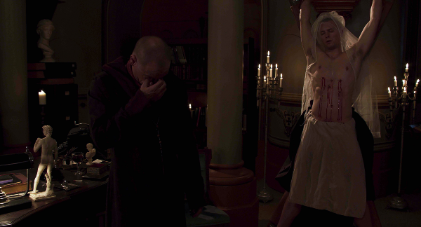 This look-alike, Daniel, is totally controlled by the predatory monastery head Father Andrew ( Andreas Apergis),who believes Daniel to be the re-incarnation of Saint Sebastian, sent by God for Andrew’s’ carnal pleasure. It’s inevitable that the two D’s will meet, and equally obvious that they are identical twins.
