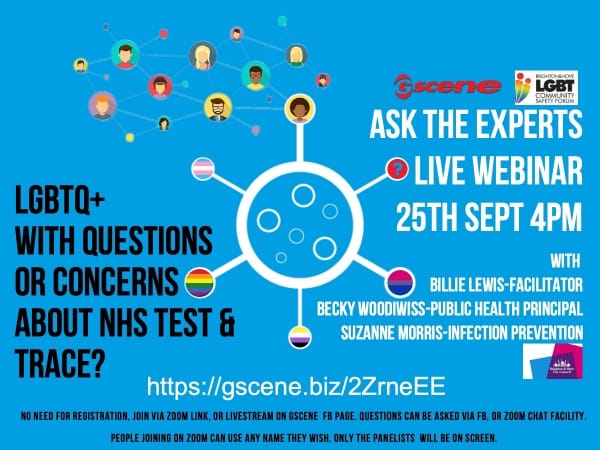 This is an opportunity for anyone from the LGBTQ+ community to seek answers to questions or concerns about the NHS Test & Trace system which is now being used across the country to follow up any new Covid-19 infections and contact and inform people who may have been exposed to Covid-19 through close contact.