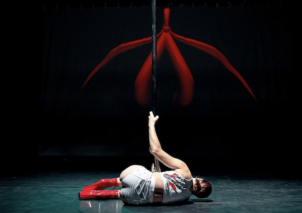 To quote her, this show is about “an orgasmic performance about the sacrifice of a female body”. And within the opening minute or two she’s as good as her word, gyrating and writhing on the ground with the pole between her legs. It’s a full-on example of what’s to come for the next 50 minutes.