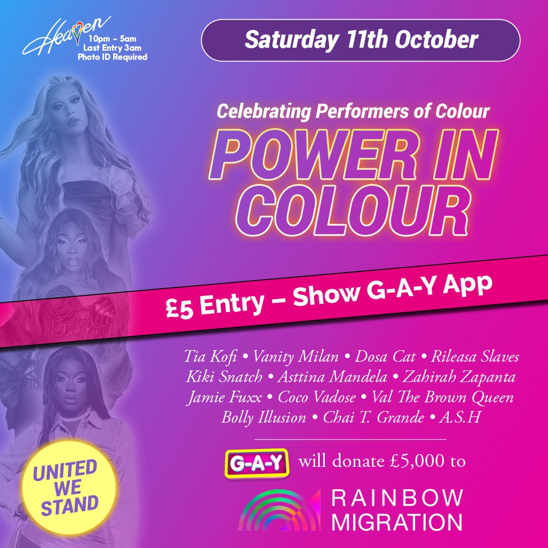 G-A-Y will donate £5,000 to Rainbow Migration at Power In Colour at Heaven Nightclub on Saturday, 11 October.