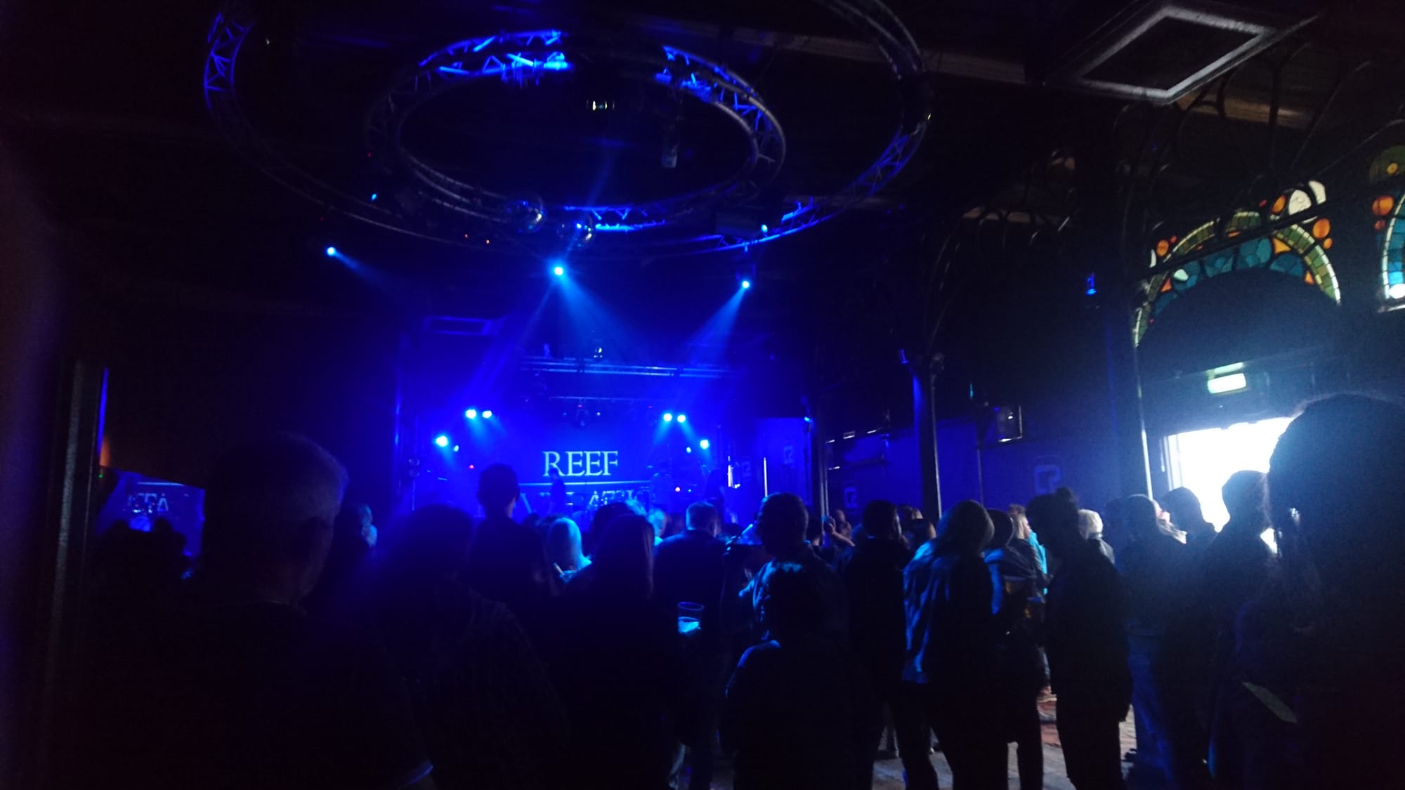 As the energetic singer Stringer and bassist Bessant jump about the stage and call out to the audience, the driving sounds of newer track First Mistake swim around the tiny room. Instantly the stain glass windows and decorated beams melt away into a dusty wooden bar with creaking walls and overhanging balconies that could split at any moment. With each twang of guitar, and smokey vocals, Reef paint a picture of an old rundown pub lost in the middle of desert in the wild west.