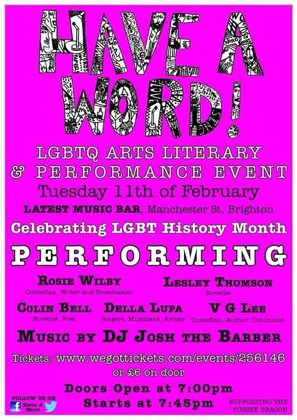 Have A Word…LGBTQ Arts Poetry Performance night returns to the Latest Music Bar this evening. Artists appearing include: • V G Lee…Comedian Author Columnist • Lesley Thomson… Novelist • Rosie Wilby …Comedian Writer and Broadcaster • Colin Bell… Novelist Poet • Della Lupa … Singers Musicians Artists