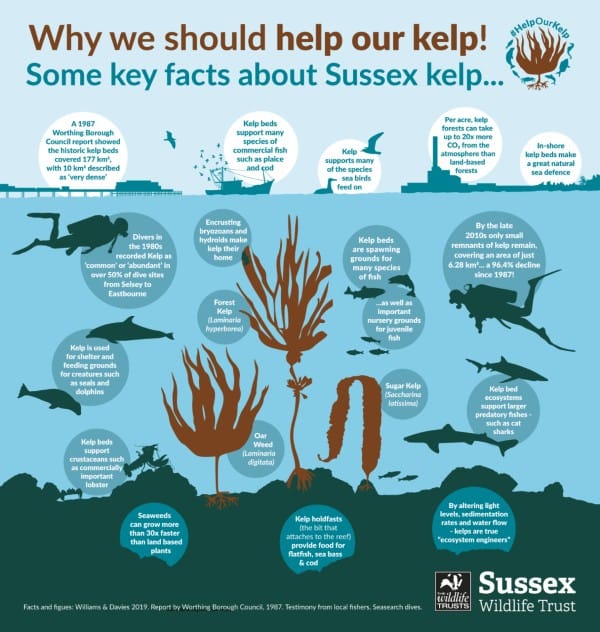 Kelp once stretched along 40 km of the West Sussex coastline from Selsey to Shoreham, forming an underwater forest that extended at least 4 km seaward. It provided a vital habitat, nursery and feeding ground for seahorses, cuttlefish, lobster, sea bream and bass. It locked up huge quantities of carbon, helping us to fight climate change, while improving water quality and reducing coastal erosion by absorbing the power of ocean waves.
