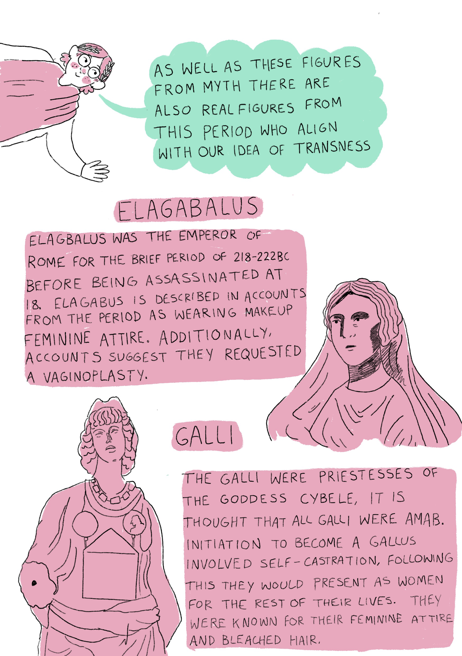 Another project in relation to trans history is an illustrated zine by Rowan Frewin that looks at trans and non-binary figures even further back in history in history from Roman times to Stonewall Riots. The zine started as an illustrated presentation they made for Comics Youth as part of an ongoing project and now is available in printed format.