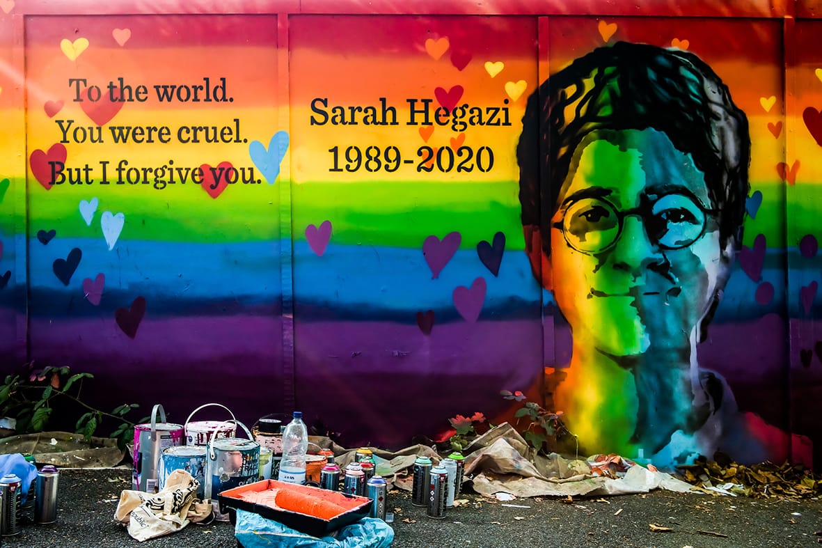 LGBTQ+ as a community knows no borders. The exhibition includes the tragic story of Sarah Hegazi, one of the most well-known lesbian heroes of recent years for queer people in the Middle East. Sarah Hegazi (1989-2017) was an Egyptian socialist, writer and lesbian activist. She was arrested, imprisoned, and tortured in Egypt for three months after flying a rainbow flag at a Mashrou’ Leila concert in Cairo in 2017. Hegazi lived with PTSD resulting from the prison torture she experienced in Egypt. She was granted asylum in Canada, living there until her death.