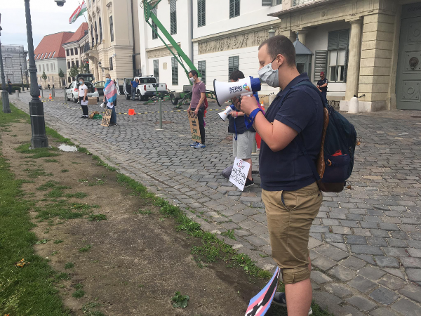 Trans activists & allies have this afternoon been protesting outside the legal residence of the Hungarian Prime Minister, observing social distancing protocols whilst doing so.