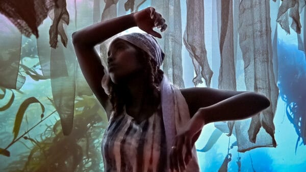 The installation, originally commissioned by the Sussex Wildlife Trust, simulates an underwater kelp forest. More than 100 bespoke textile strips will be suspended in the eight-metre-high gallery, complemented by underwater and dance films, underwater photography, sound and special lighting.