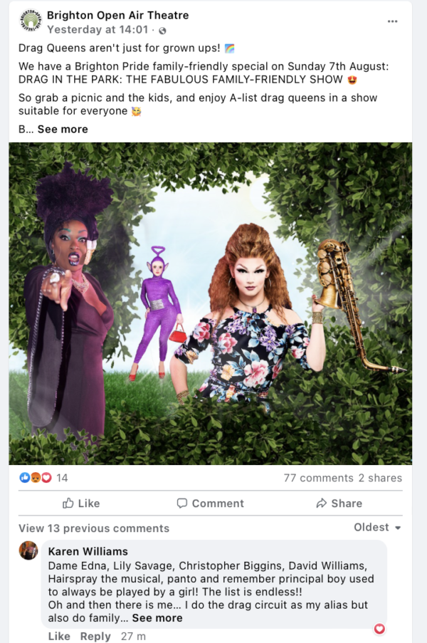 In a now deleted post Gerry Holloway, who is director of ‘community history publisher’ QueenSpark Books, said that “drag is not family friendly”, while another rants that “There is NOTHING child friendly about drag queens and certainly not a damn thing woman friendly about them!”