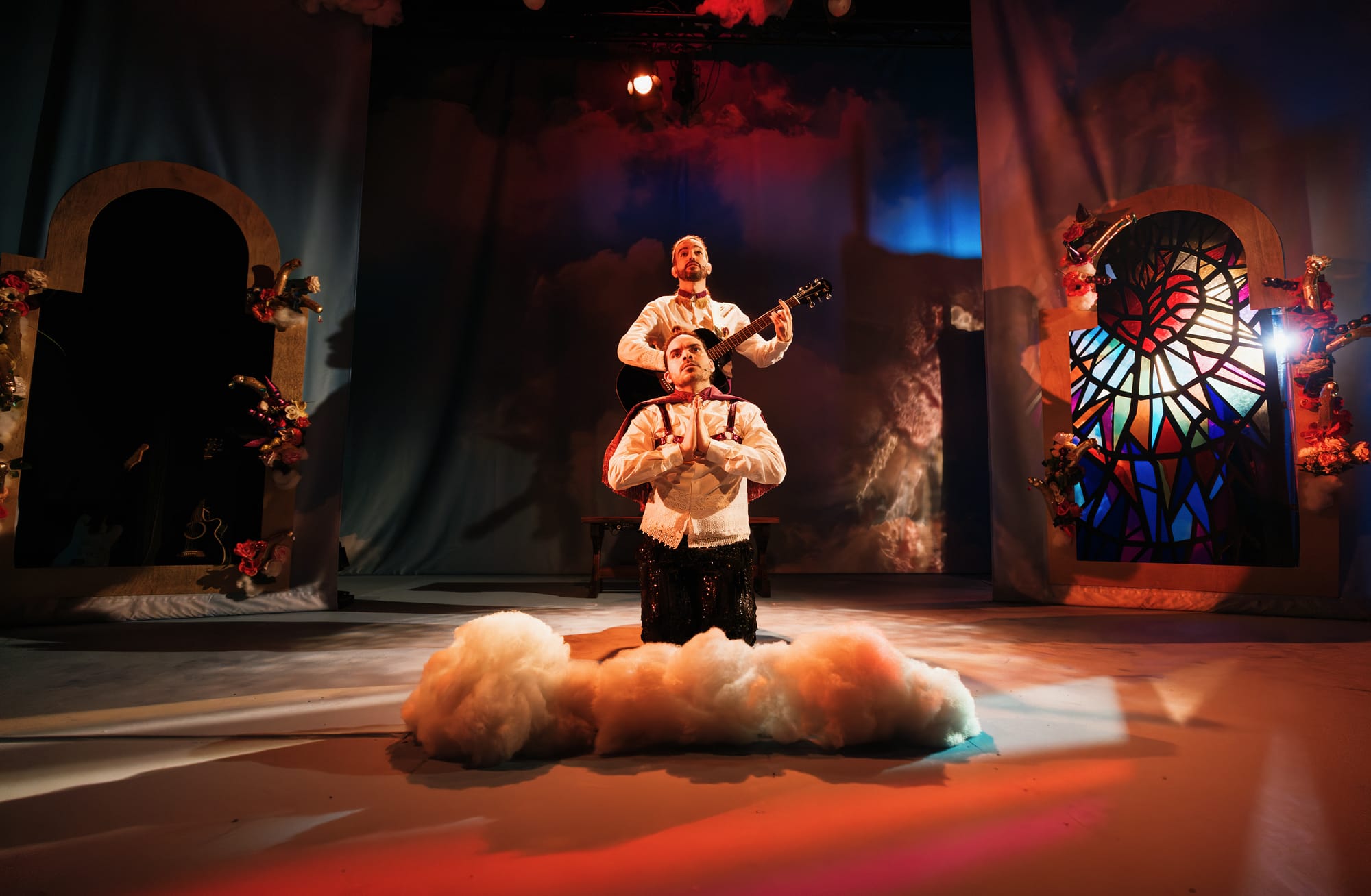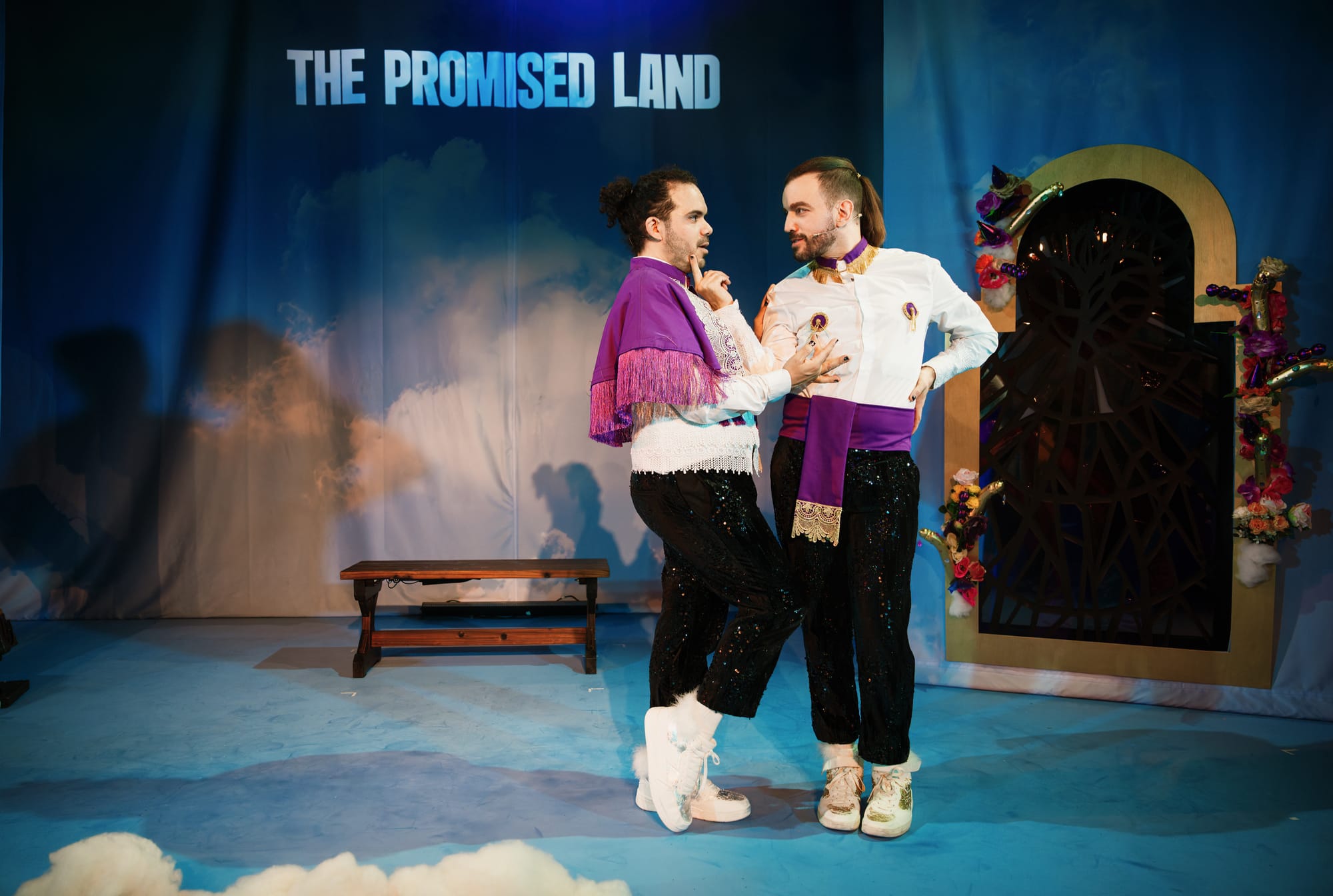 Much of this is down to the magnetic alchemy of the two performers and creators, Sergio Maggiolo & Guido García clad in the purple and white of South American Catholicism that lets the iconography do some heavy lifting while the performers get on with being delightful. Their chemistry is authentic in a way that can't be manufactured: this is their show, story, and blasphemy, and they inhabit it with the radiant, unguarded pride of people who have created something genuinely personal. Their performances lean fully, magnificently into melodrama, the camp occasionally teeters toward critical mass, but that excess is the joke, a knowing wink at the genre that gives the show so much of its outrageous, irresistible charm.