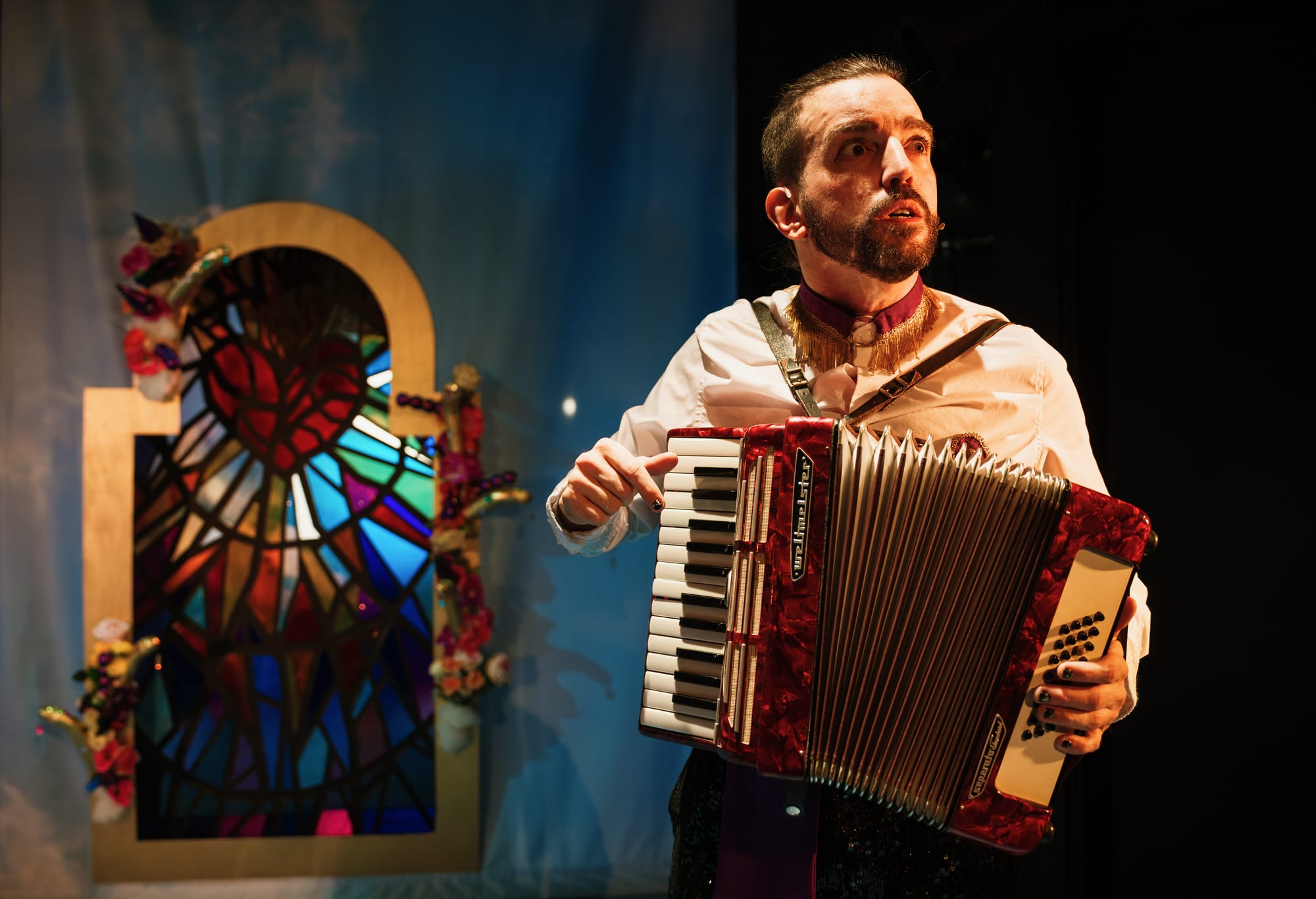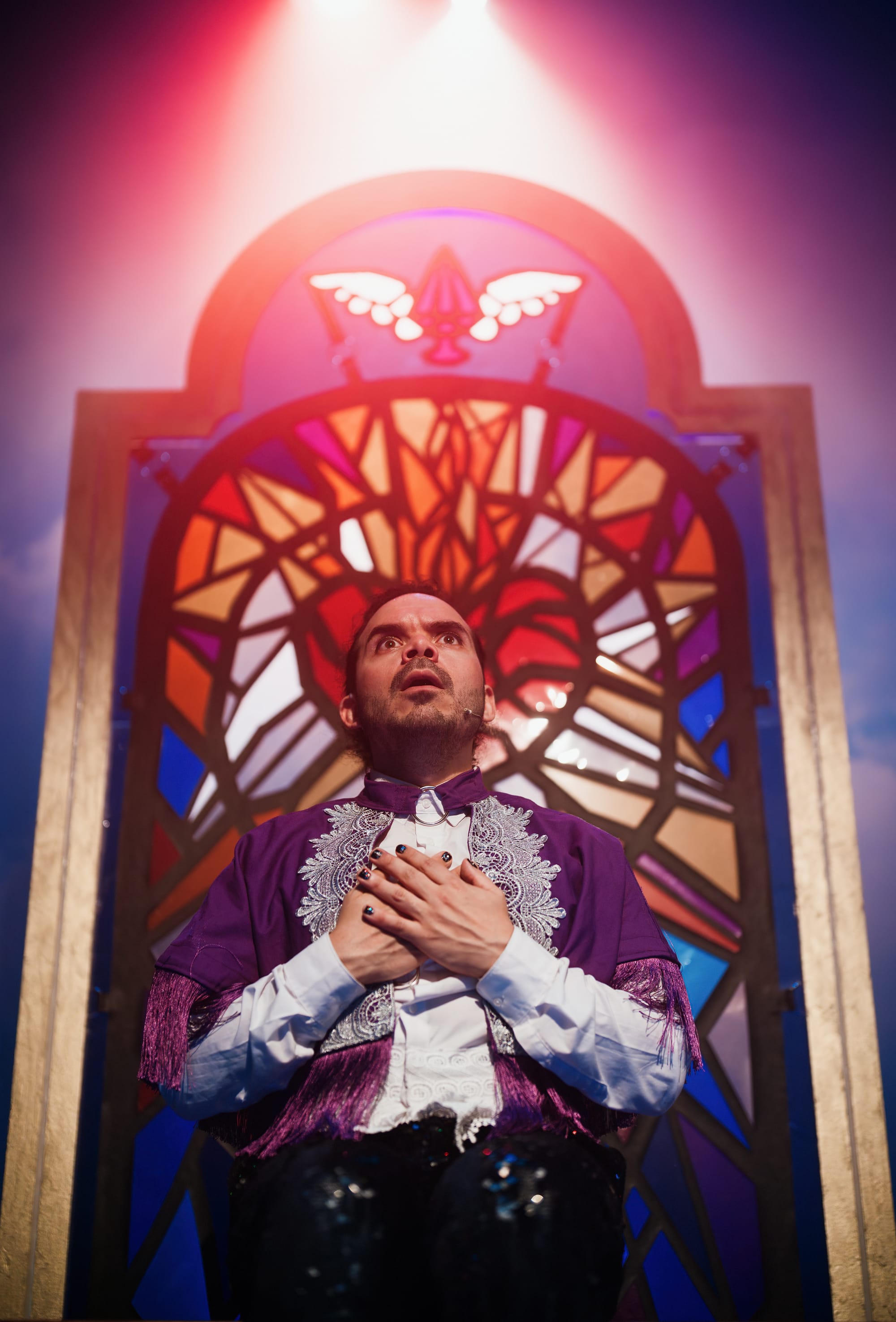 Those heavy themes are touched, singed briefly like a liturgical candle held to an altar cloth, then bounced firmly back toward sequins. The production returns, again and again, to an affectionate, even slightly reverent, relationship with the Catholic aesthetic it is nominally skewering. The cross remains, lovingly lit. But underneath all the flamboyant cabaret numbers beats a sweet, soppy message about queer love winning through, and the audience, bless every one of their miraculous souls, received this gospel with pentecostal enthusiasm.
