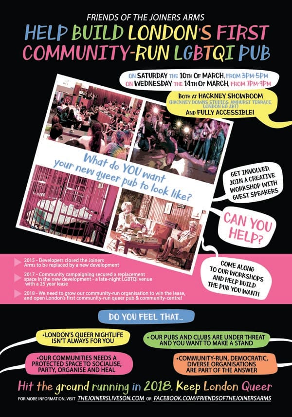 The Friends of the Joiners Arms, who fought for 3 years to protect the legacy of the legendary Hackney Road LGBT+ pub, are holding public meetings to include everyone who wants to play a part in deciding how to create a radical, community-run venue on the site of the Joiners Arms.