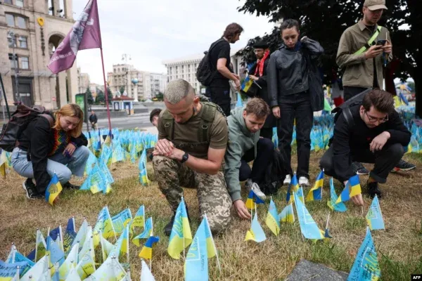 Viktor Pylypenko, a Ukrainian soldier who has served as a rifleman and paramedic in the Kyiv, Kharkiv and Donetsk regions, said his group brought two messages to the march, each one displayed on banners.