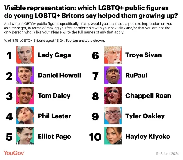 Lady Gaga, Tom Daley and Elliot Page have made their mark on young LGBTQ+ Britons, new YouGov survey shows