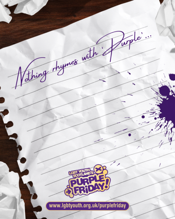 This Purple Friday, join LGBT Youth Scotland in celebrating self-expression, love, and community with a poetic twist. The charity says: “Together, we can write a brighter future for LGBTQ+ young people across Scotland.”
