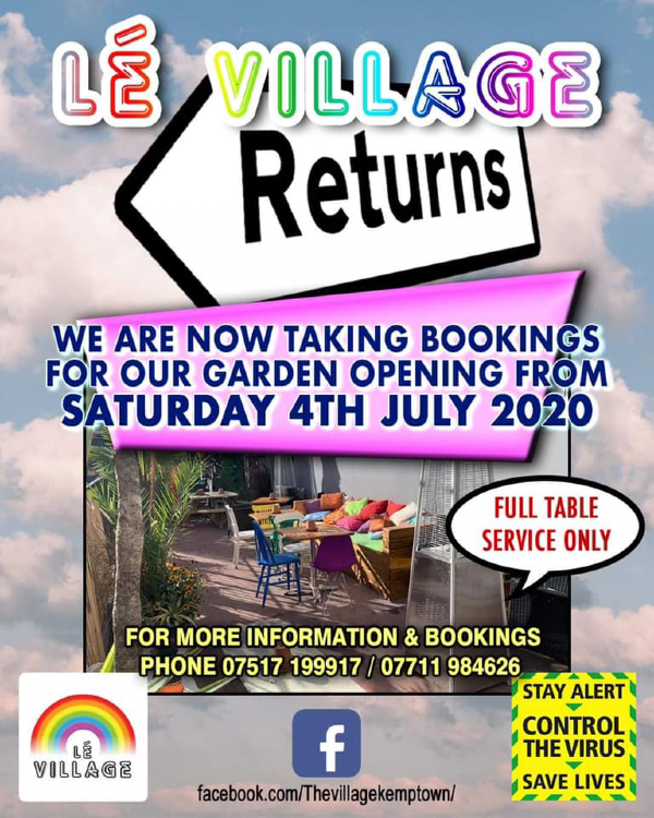 Le Village Brighton, the LGBTQ+ venue in the heart of Kemptown, is now taking bookings (full table service only) for its sunny scene-side garden terrace from Saturday, July 4.
