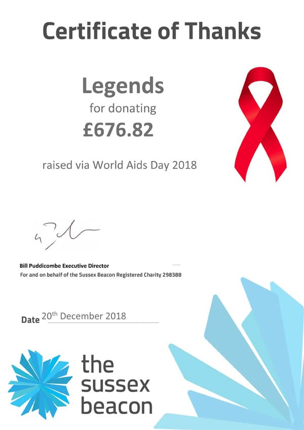 I write to thank Tony Chapman, Dan Austin and all the team at Legends, on behalf of The Sussex Beacon, for the very generous donation of £338.41 raised at your World Aids Day 2018 fundraiser and thank Tony Chapman for matching this amount, bringing the total raised to a fabulous £676.82.