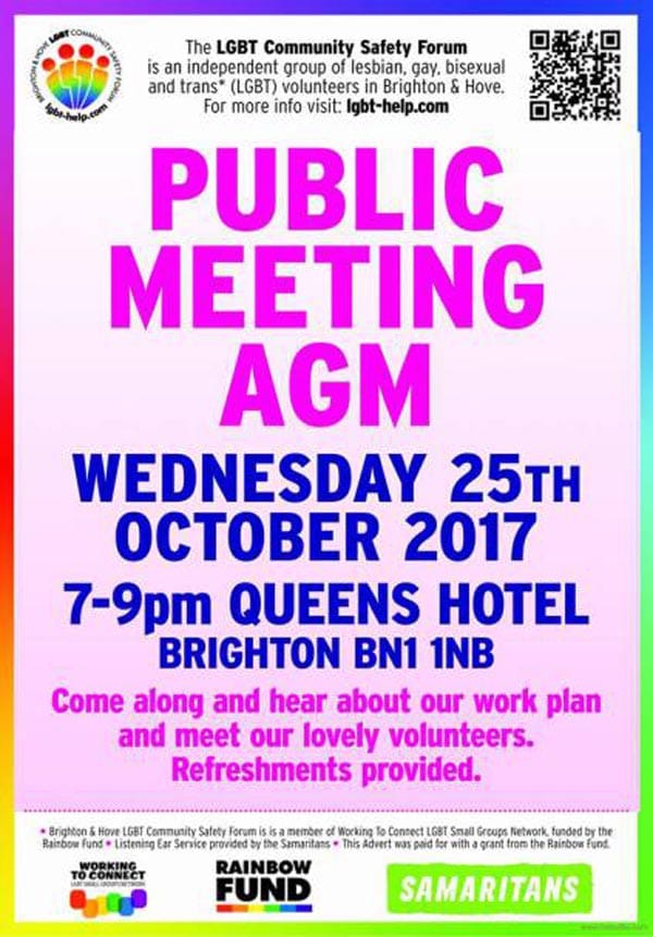 The Brighton Hove LGBT Community Safety Forum (B&H LGBT CSF) has its Annual General Meeting tonight at the Queens Hotel, 1-3 Kings Road, Brighton at 7pm.