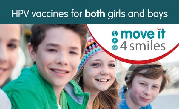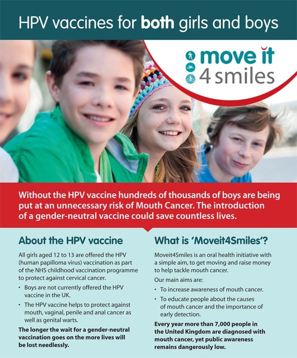 The Moveit4smiles campaign encourages dental practices and teams of Dental Care Professionals to organise their own events to raise awareness of mouth cancer and campaign towards the NHS making HPV vaccinations available to all boys on the NHS – at the moment the vaccination is only available for girls.