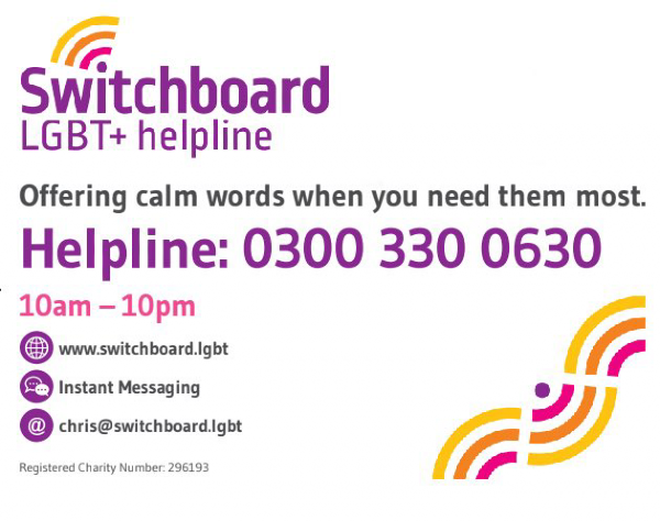 Anyone LGBTQ+ who needs to get in touch and talk to one fo their volunteers about emotional well-being can do so by phoning 0300 330 0630. Alternatively email chris@switchboard.lgbt, or even instant message them at www.switchboard.lgbt for a friendly and confidential chat.