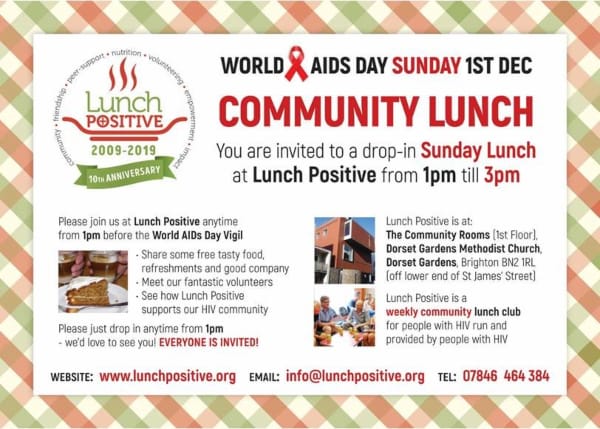 Lunch Positive, the weekly HIV lunch club are holding a World AIDS Day Community Lunch on Sunday December 1st at Dorset Gardens Methodist Church, Dorset Gardens, Brighton.