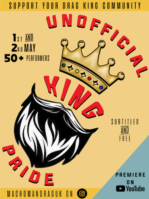 Macho Man Drag UK, which produces, curates and hosts live drag king shows in the United KINGdom, will host FREE Unofficial King Pride streaming events on YouTube on May 1 & 2 at 10pm, featuring over 50 drag kings from around the world over two days and raising funds for HIV/sexual health charity Terrence Higgins Trust (THT).